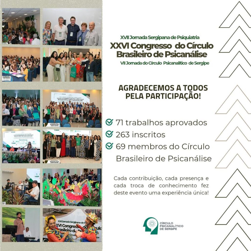Nos dias 07 a 09 de Agosto de 2025 vivemos de muita emoção no XXVI Congresso do Círculo Brasileiro de Psicanálise, em Aracaju, junto à XVII Jornada Sergipana de Psiquiatria e à VII Jornada do Círculo Psicanalítico de Sergipe.